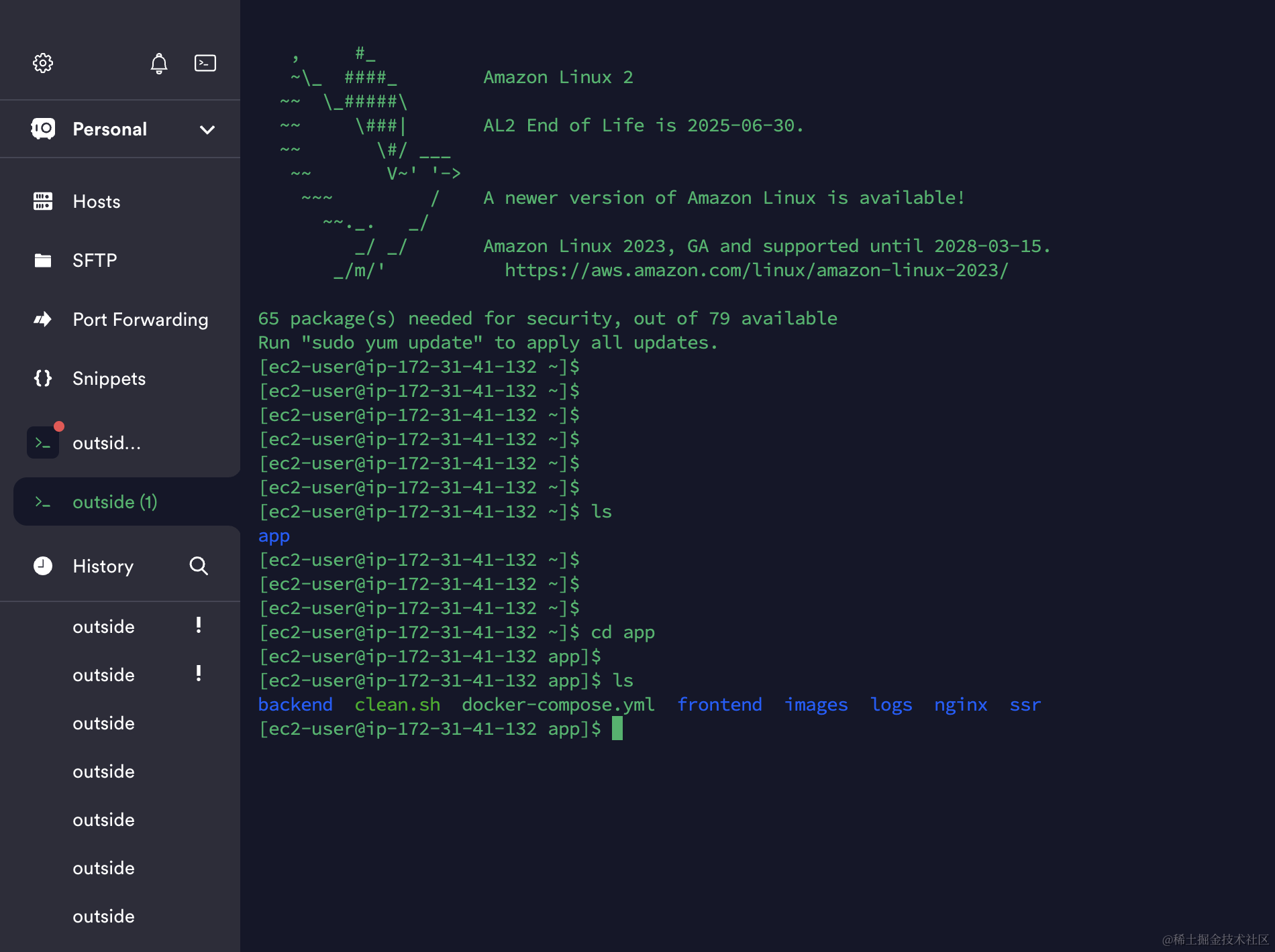 1.5、Accept the new docker group permissions by logging out and logging back in. To do this, close the current SSH terminal window and reconnect to the instance in a new terminal window. Your new SSH session should have the appropriate docker group permissions.